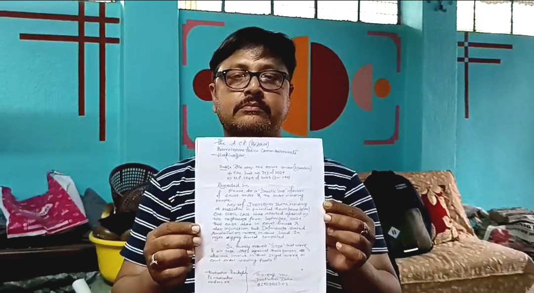 নিজস্ব প্রতিনিধি , উত্তর ২৪ পরগণা - আদালতের নির্দেশ না মেনে পৈতৃক সম্পত্তি জবরদখল করে নির্মাণের অভিযোগ উঠেছে প্রোমোটারদের বিরুদ্ধে। ঘটনায় ব্যাপক চাঞ্চল্য ছড়িয়েছে হালিশহরের বাঁধাঘাট এলাকায়। অভিযোগ, পুলিশ ও প্রশাসনের দ্বারস্থ হয়েও কোনও সুরাহা মেলেনি। বর্তমানে সপরিবারে আতঙ্কের মধ্যে দিন কাটাচ্ছেন। কর্তৃপক্ষের নিষ্ক্রিয়তায় সাধারণ মানুষের নিরাপত্তা নিয়ে উঠছে গুরুতর প্রশ্ন।