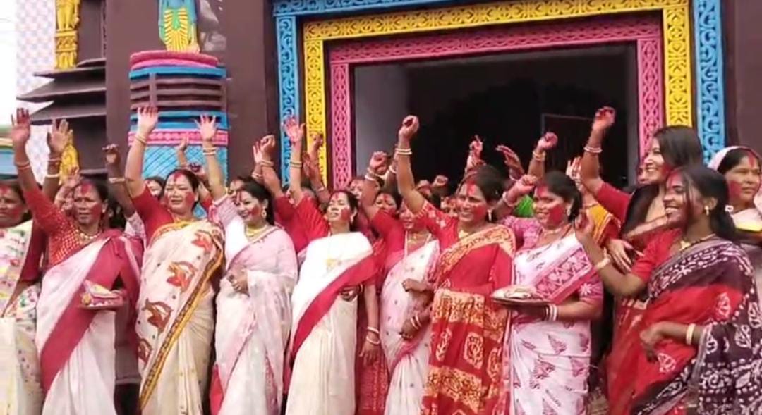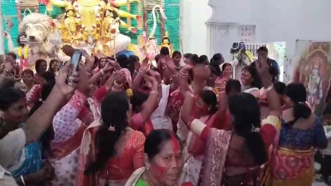 সূত্রের খবর , সিঁদুরে রাঙানো উমার বিদায়ের মুহূর্তে মালদহের পুরাতন শহরের কালুয়াদীঘি পল্লীশ্রী পুজো মণ্ডপে ভক্তদের মধ্যে দেখা গেল এক অনন্য আবেগঘন দৃশ্য। চারদিনের আনন্দ , উল্লাস সহ ভক্তিময় মুহূর্তের পর আজ মাকে বিদায় জানানোর পালা। চলছে দশমীর শেষ লগ্নের পুজো , সঙ্গে চলছে সিঁদুরখেলা , ঢাকের তালে নাচ আর চোখের কোণে জমে থাকা জল।