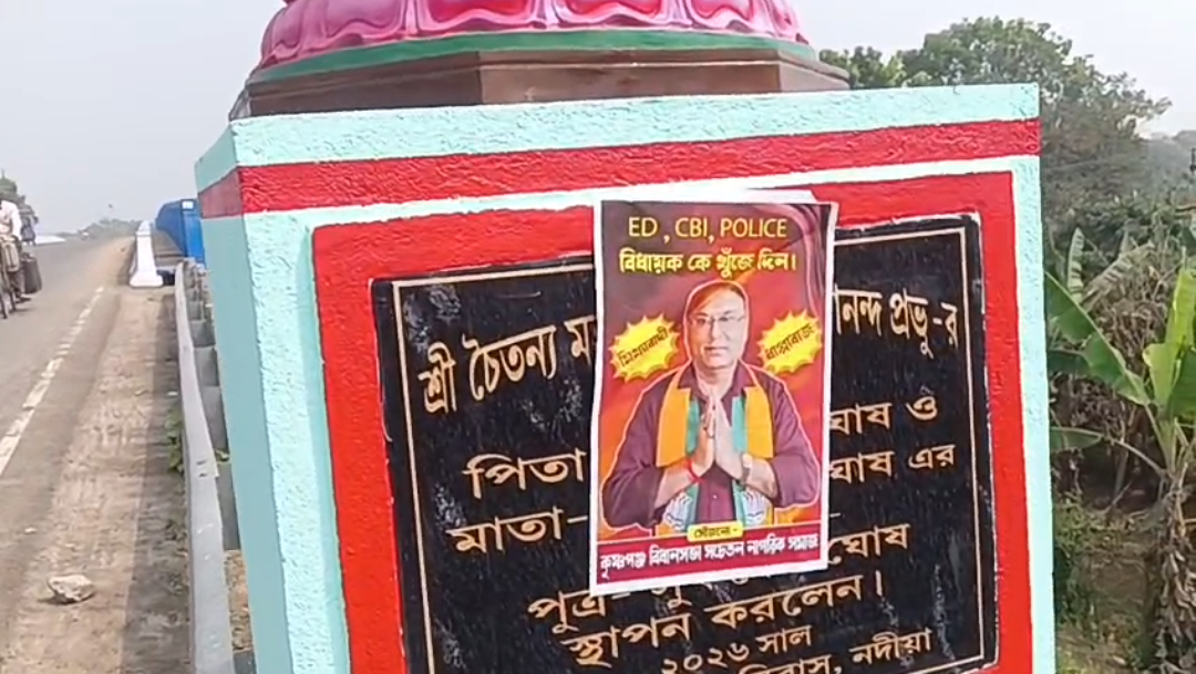 নিজস্ব প্রতিনিধি , নদীয়া - 'বিধায়ককে খুঁজে দিন' - নির্বাচনের আগে এমন পোস্টার ঘিরে শুরু হয়েছে নতুন জল্পনা। ঘটনায় চাঞ্চল্য ছড়িয়েছে কৃষ্ণগঞ্জে। শুরু হয়েছে রাজনৈতিক তরজা। শাসকদল বিষয়টিকে হাতিয়ার করলেও, বিরোধী শিবিরের অভিযোগ - এর নেপথ্যে তৃণমূলের চক্রান্ত। ভোটের মুখে এই বিতর্ক রাজনীতিতে নতুন মাত্রা যোগ করেছে।