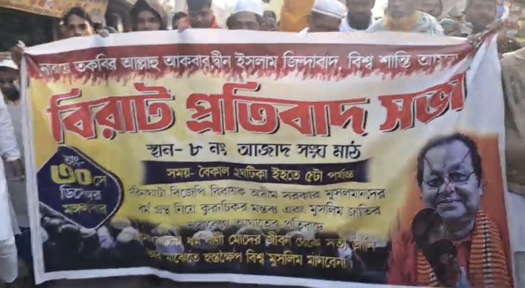 স্থানীয় সূত্রের খবর , আজাদ সঙ্ঘের মাঠ থেকে একটি বিশাল প্রতিবাদ মিছিল বের হয়ে প্রায় তিন কিলোমিটার পথ অতিক্রম করে বটতলা মোড়ে পৌঁছায়। মিছিলে বিজেপি বিধায়ক অসীম সরকারের বিরুদ্ধে তীব্র স্লোগানে মুখর হয়ে ওঠে গোটা এলাকা। বিধায়ক ইচ্ছাকৃতভাবে মুসলিম সম্প্রদায়ের ধর্মীয় ভাবাবেগে আঘাত করেছেন। বটতলা মোড়ে পৌঁছে অসীম সরকারের কুশপুতুল দাহ করা হয়। উত্তেজিত জনতা কুশপুতুলে জুতোর মালা পরিয়ে ক্ষোভ প্রকাশ করে। অবিলম্বে গ্রেফতার না হলে আগামীদিনে আরও বৃহত্তর আন্দোলনে নামবে মুসলিম সংগঠনগুলি।