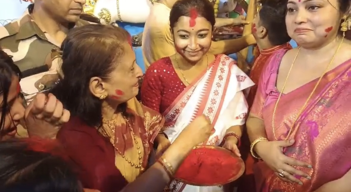 রাজবাড়ির প্রাচীন রীতি মেনে দেবীকে আরাধনা করার পর শুরু হয় বরণ। একে একে গৃহবধূরা এগিয়ে এসে দেবীর কপালে সিঁদুর দিয়ে উমাকে বিদায় জানানোর প্রস্তুতি নেন। আর সেই মুহূর্তেই প্রত্যেক বছরের মতো এবছরও সিঁদুর খেলায় যোগ দিলেন বর্তমান রানীমা অমৃতা রায়। হাতে সিঁদুর, চোখে জল। বিদায়ের আচার যেন হয়ে উঠল এক আবেগের প্রতীক।