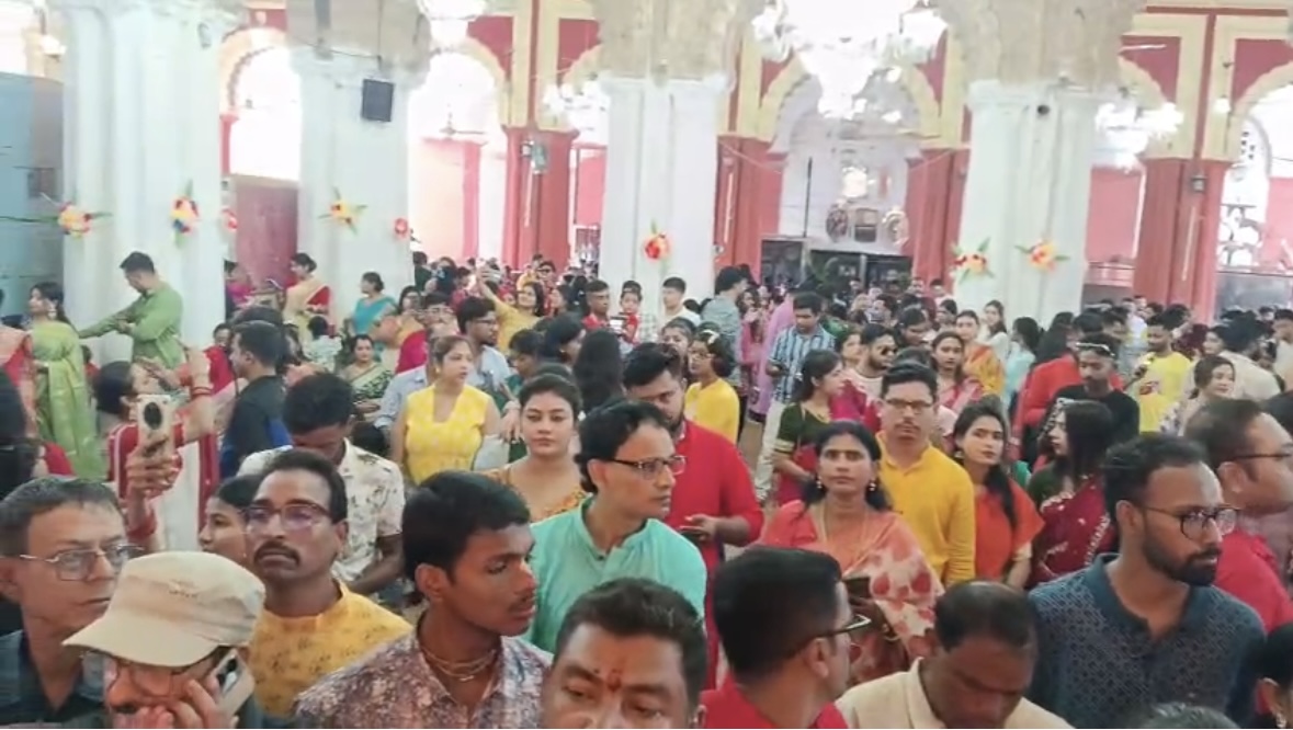 আজ দশমীর দিনে শেষ আরাধনার পর নাটমন্দিরে দেবীকে বরণ করেন রাণীমা । এরপর গৃহবধূদের সঙ্গে সিঁদুর খেলায় মেতে উঠলেও, বিদায়ের মুহূর্তে আবারও ছড়িয়ে পড়ে হারানোর বেদনা। সিঁদুরের লাল রঙের মাঝে যেন মিশে যায় আবারও এক বছরের প্রতীক্ষা, মায়ের আগমনের আশায়।