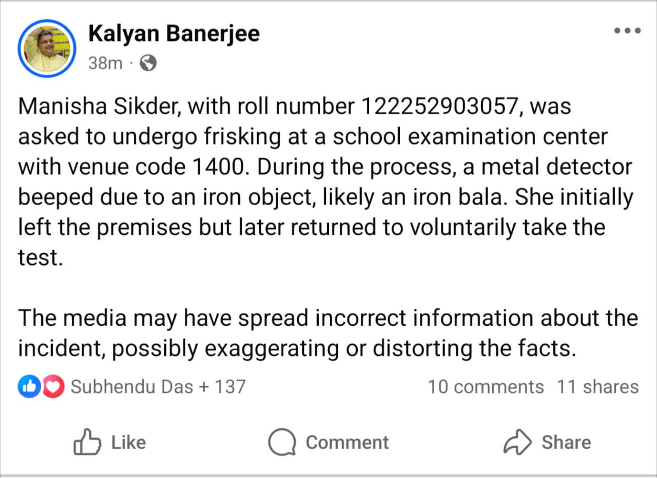 সেই বিতর্কে এবার জবাব দিলেন তৃণমূল সাংসদ কল্যাণ বন্দ্যোপাধ্যায়। তিনি তার সমাজ মাধ্যমে পোস্ট করে জানান, ' পরীক্ষার্থী মনীষা সিকদার, রোল নম্বর ১২২২৫২৯০৩০৫৭, ভেন্যু কোড ১৪০০-এর একটি স্কুলে পরীক্ষায় বসেন। তল্লাশির সময় একটি লোহার বস্তু, সম্ভবত লোহার বালা, মেটাল ডিটেক্টরে ধরা পড়ে। তিনি প্রথমে পরীক্ষাকেন্দ্র থেকে বেরিয়ে গেলেও পরে স্বেচ্ছায় ফিরে এসে পরীক্ষা দেন।'