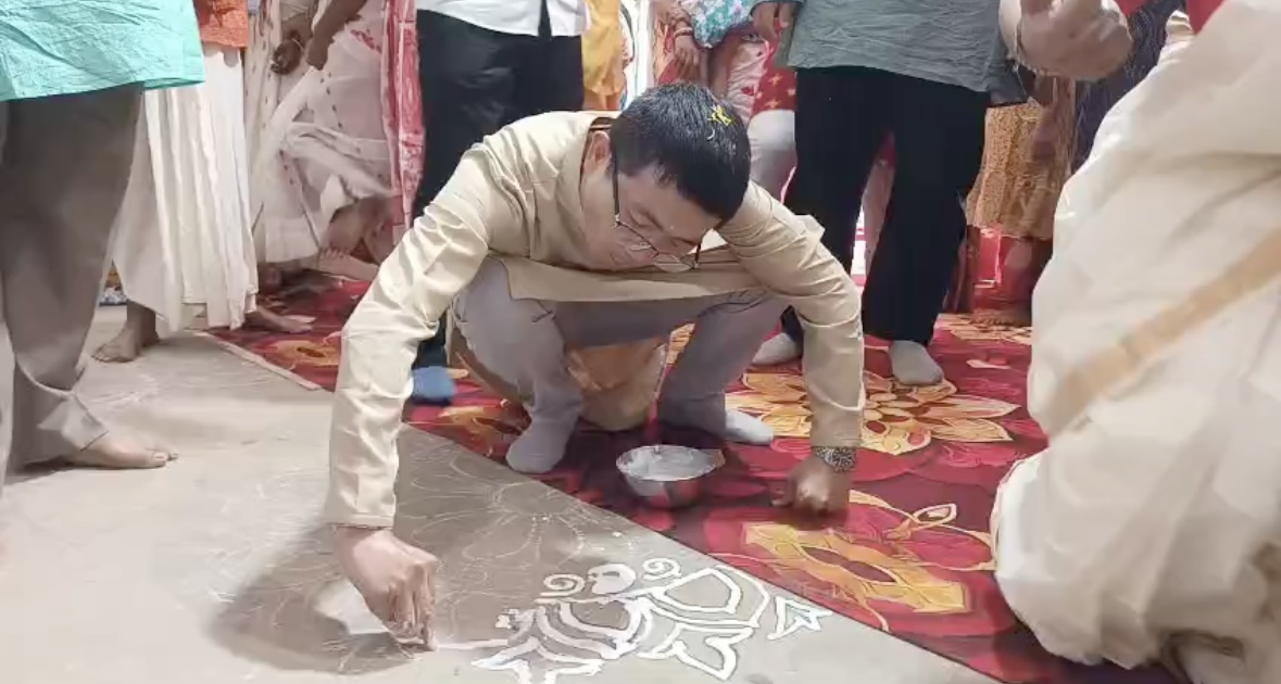 কেউ আবার আলপনা দেন, কেউ বা ছোটদের সঙ্গে মেতে ওঠেন নাড়ু পাকানোয়। শেষ পর্যন্ত মা দুর্গার সামনে সবাই মিলে আরতি করে পুজোর আনন্দ ভাগ করে নেন।পুজোর আবহে আন্তর্জাতিক বন্ধুত্বের এই রঙিন আয়োজন গ্রামবাসীদের পাশাপাশি উপস্থিত দর্শকদেরও মুগ্ধ করেছে।