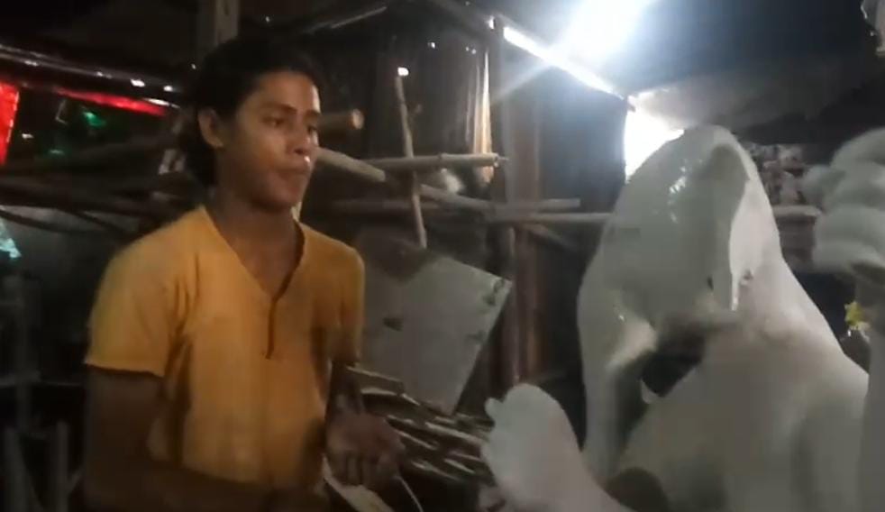 শেষ মুহূর্তের কাজে বাধা হয়ে দাঁড়িয়েছে বৃষ্টি। তবে এক একজন মৃতিশিল্পী দুর্গা মায়ের সবথেকে কাছের সন্তান। তারা খুব ভাল করেই জানেন মাকে কিভাবে সাজিয়ে তোলা যায়। তাই ঝমঝমিয়ে বৃষ্টির মধ্যেও সুযোগ বুঝে একটু একটু করে দুর্গা মাকে সাজিয়ে তুলছেন তারা।