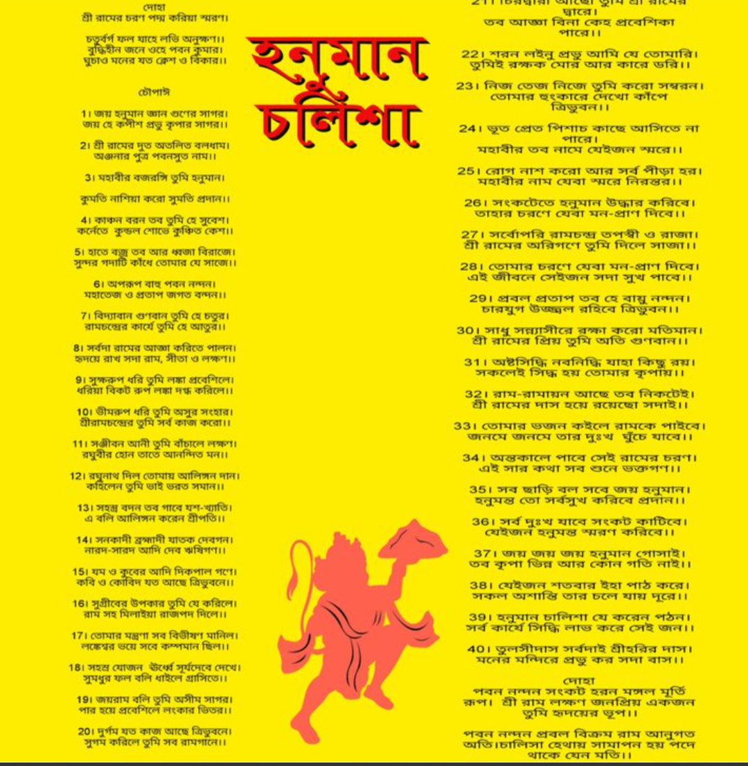 নিজস্ব প্রতিনিধি , বোলপুর - হিন্দু ধর্মে ভগবান হনুমান শক্তি, সাহস এবং অটল ভক্তির প্রতীক। যুগের পর যুগ ধরে ভক্তরা বিশ্বাস করে আসছেন যে তাঁর নাম স্মরণ করলে জীবনের নানা বাধা-বিপত্তি দূর হয় এবং মনোবল বৃদ্ধি পায়। এই বিশ্বাস থেকেই বহু মানুষ প্রতিদিন হনুমান চালিশা পাঠকে জীবনের একটি গুরুত্বপূর্ণ আধ্যাত্মিক অভ্যাস হিসেবে গ্রহণ করেছেন।