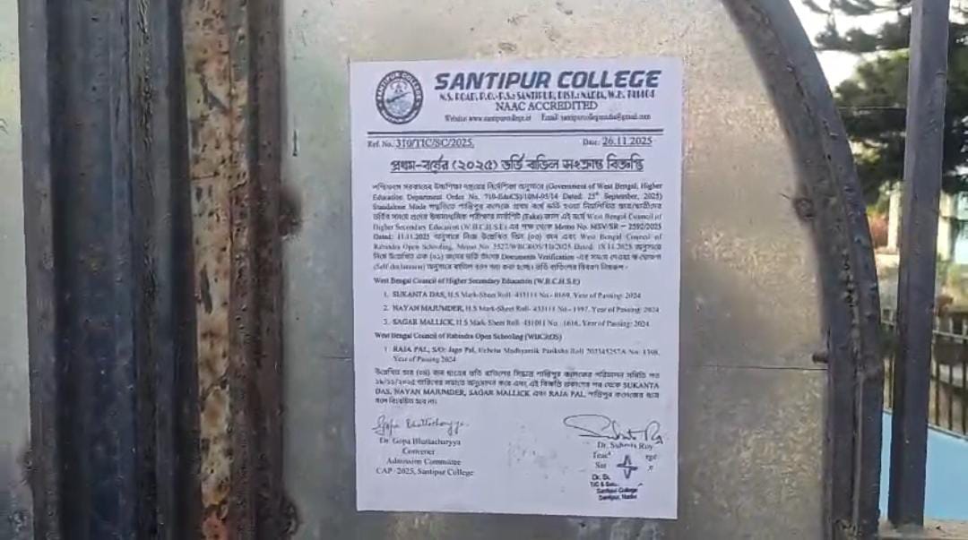 সূত্রের খবর , কয়েকমাস ধরেই শান্তিপুর কলেজে প্রথম বর্ষের ভর্তির প্রক্রিয়া চলছে। সেখানে ৬ জনের মার্কশিট নিয়ে সন্দেহ হয় কলেজ কর্তৃপক্ষের। তারা উচ্চশিক্ষা দফতরে সেই মার্কশিট স্কুটিনিতে পাঠালে দেখা যায় চারজনের রেজাল্ট ভুয়ো। এরপর নোটিশ টাঙিয়ে দেওয়া হলে তৃণমূলের দুই পক্ষের মধ্যে তুমুল বিতর্ক শুরু হয়েছে। একপক্ষের দাবি , নোটিশ কলেজ থেকে টাঙানো হয়নি। আবার এক পক্ষ জানিয়েছে , এই নোটিশ সম্পূর্ণভাবে বৈধ। এটা কলেজ থেকেই দেওয়া হয়েছে।