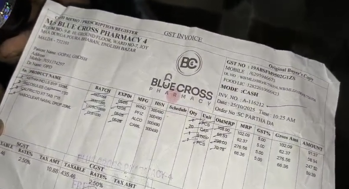 চিকিৎসক শিশুটির জন্য বেশ কিছু ওষুধ প্রেসক্রাইব করেন। এরপর ২৫শে অক্টোবর পরিবারের সদস্যরা গাজোল ট্যাক্সি স্ট্যান্ডের পাশে অবস্থিত ব্লুক্রস দোকান থেকে প্রেসক্রিপশন অনুযায়ী ওষুধ কেনেন।