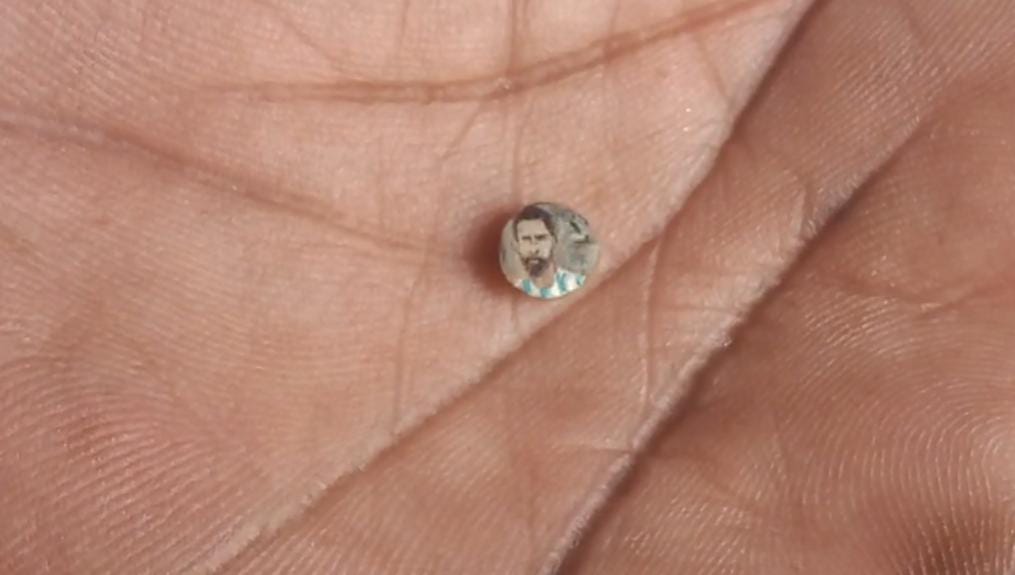নিজস্ব প্রতিনিধি , নদীয়া - কলকাতার ফুটবলপ্রেমীদের ক্ষোভের আগুন এখনও নেভেনি।চোখের সামনে থেকেও মেসিকে চোখের দেখা দেখতে পারেননি তারা। অনেকেই নিজের সঞ্চয়টুকু দিয়ে মেসিকে দেখতে গিয়েছিলেন তবে সেই স্বপ্নপূরণ হয়নি। তেমনই অনেক কষ্ট করে টিকিট করে ফুটবল জাদুকরকে দেখতে গিয়েছিলেন রানাঘাটের মানিক দেবনাথ। মেসিঅন্তে প্রাণ তিনি। সেই দেখতে না পাওয়ার কষ্ট থেকেই ছোট্ট ছোলার ডালের ওপর মেসির প্রতিকৃতি আঁকলেন তিনি।