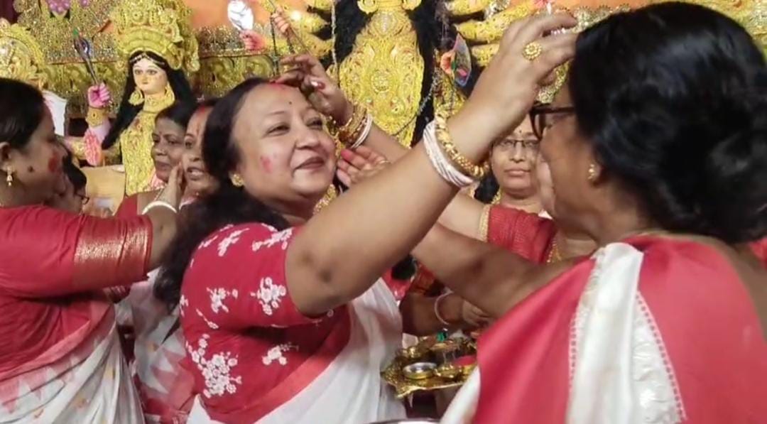 আজ বিজয়া দশমী। সকালে পুষ্পাঞ্জলি , সন্ধ্যায় ঘট নিরঞ্জনের আগে , এই উৎসবের অন্যতম আবেগঘন পর্ব - সিঁদুর খেলা। রঙিন শাড়িতে সেজে , হাতে থালা ভরা সিঁদুর নিয়ে মণ্ডপে হাজির মহিলারা। মা দুর্গার সিঁথিতে সিঁদুর পরিয়ে , একে অপরকে সিঁদুরে রাঙিয়ে তারা জানালেন বিদায়ের বেদনার কথা। কিন্তু সেই বিদায়ের মাঝেও ছিল এক অনন্য বন্ধন , ছিল ভালোবাসা , ছিল নারীসমাজের ঐক্যের বার্তা।