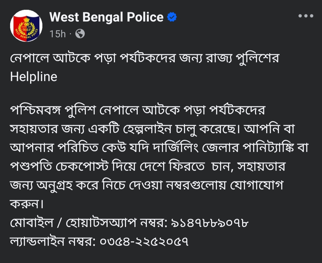 সূত্রের খবর, প্রতিবেশী নেপালে চলতে থাকা অশান্তির জেরে সীমান্তে কড়া নজরদারি জারি হয়েছে। এই অবস্থায় যেসব পর্যটক নেপালে গিয়ে আটকে পড়েছেন, তাঁদের কথা ভেবেই হেল্পলাইন চালু করেছে পশ্চিমবঙ্গ পুলিশ। ফেসবুক পোস্টের মাধ্যমে জানানো হয়েছে, আটকে পড়া কেউ যদি দেশে ফিরতে চান, তবে পানিট্যাঙ্কি বা পশুপতি চেকপোস্ট ব্যবহার করতে হবে। সেই সঙ্গে যাত্রার আগে রাজ্য পুলিশের হেল্পলাইন নম্বরে যোগাযোগ করার পরামর্শ দেওয়া হয়েছে। হেল্পলাইন নম্বর দুটি হলো - মোবাইল ও হোয়াটসঅ্যাপ- ৯১৪৭৮৮৯০৭৮, ল্যান্ডলাইন- ০৩৫৪-২২৫২০৫৭।