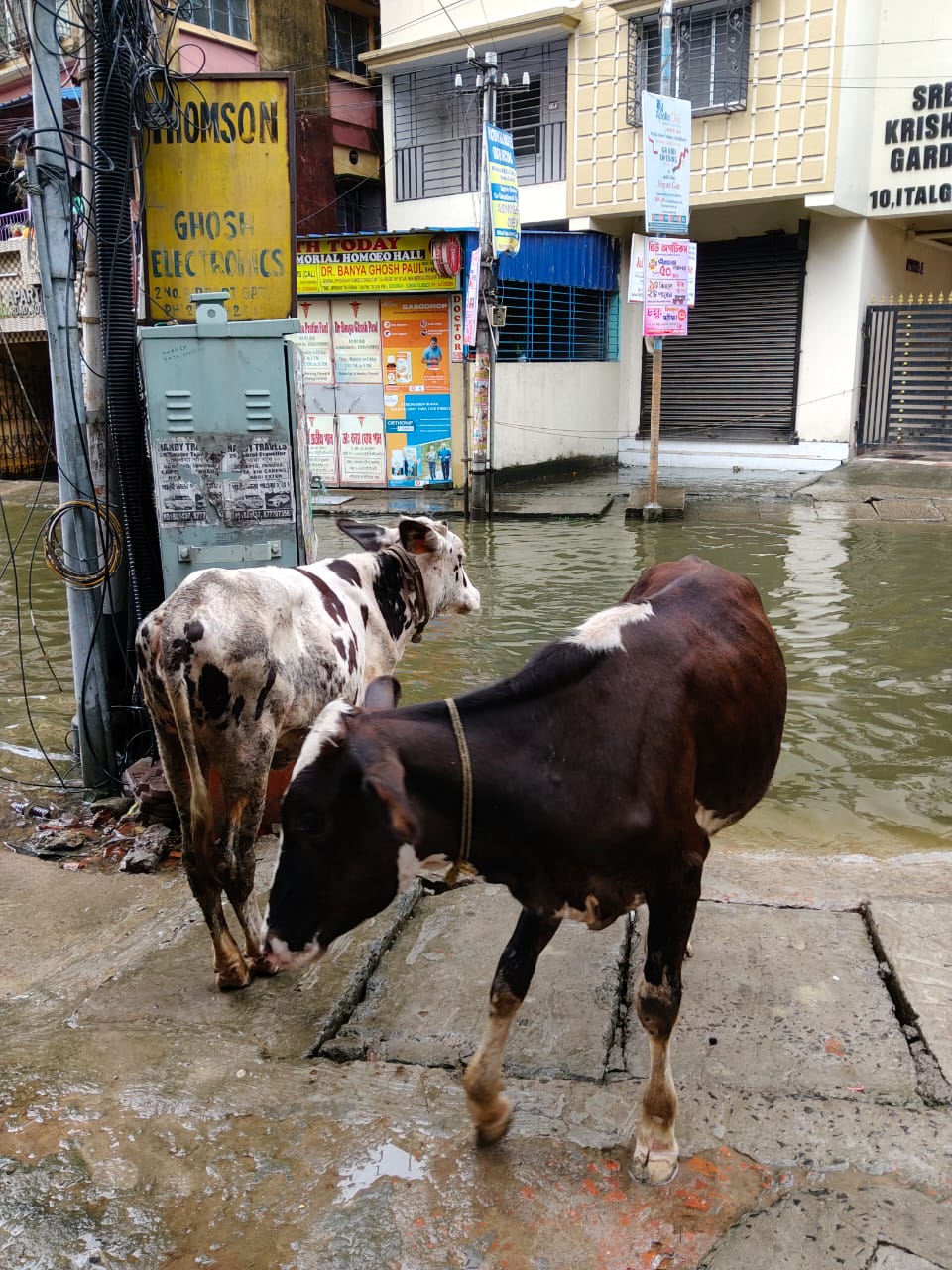 গরু , ছাগল , কুকুর , বিড়াল ভগবানের সন্তান এরাও। এমনিতেই নিত্যদিন রাস্তায় মানুষের অবহেলায় দিন কাটাতে হয়। এদিক থেকে তাড়া খেলে ওদিকে যেতে হয়। গুটিকয়েক ভাল মানুষের মধ্যে অধিকাংশই অবহেলা করে তাদের। আজ তাদের অবস্থা চোখে দেখা যাচ্ছে না। বৃষ্টিতে জলের তলায় তারাও। একটু ফাঁকা জায়গা পেলেই উঠে আসার চেষ্টা করছে ডাঙায়। কিছু ভাল মানুষ তাদের বারান্দায় যতটা সম্ভব কুকুর বিড়ালের আশ্রয় দিয়েছেন। আবার কিছু গরু সকালবেলা গোয়াল থেকে হাঁটতে বেরোয়। তাদের অবস্থা ভীষণই শোচনীয়। চারিদিকে জলের জেরে হারিয়ে গেছে তাদের চেনা রাস্তা।