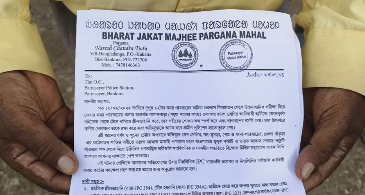 আদিবাসী সম্প্রদায়ের জেলা পরিষদের সদস্য সান মান্ডির জানান, “আজকে আমরা পাত্রসায়ের থানাতে মাঝি পরগনা মহল ও জওয়ান মহলের উদ্যোগ্যে একটি ডেপুটেশন জমা দিতে এসেছি। আমাদের বলাইডাঙ্গার একটি মেয়েকে সাইকেল থেকে নামিয়ে যৌন হেনস্থা করা হয়।