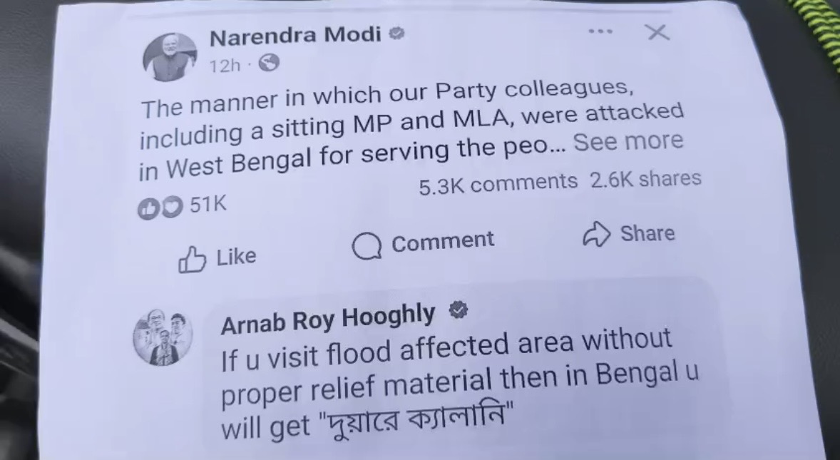 সূত্রের খবর , সোমবার উত্তরবঙ্গের নাগরাকাটায় বন্যা দুর্গতদের সঙ্গে দেখা করতে গিয়ে আক্রান্ত হন বিজেপি সাংসদ খগেন মুর্মু ও বিধায়ক শংকর ঘোষ। সেই ঘটনার নিন্দা জানিয়ে প্রধানমন্ত্রী নরেন্দ্র মোদি সমাজ মাধ্যমে একটি পোস্ট করেন। সেই পোস্টের নীচে মন্তব্য করেন উত্তরপাড়ার ২৩ নম্বর ওয়ার্ডের তৃণমূল কাউন্সিলর অর্ণব রায়।