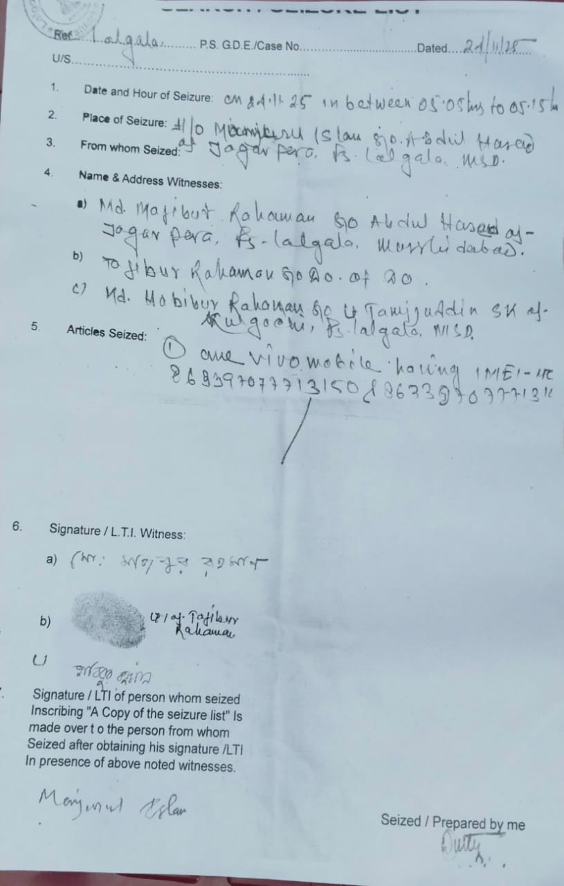 স্থানীয় সূত্রে জানা গেছে , সোমবার গভীররাতে লালগোলা থানার ওসি সহ ১ সিভিক ভলান্টিয়ার শিক্ষক মানজারুল হোসেনের বাড়িতে হানা দেয় ।অভিযোগ,সেই সময় শিক্ষকের বাড়িতে তিন প্যাকেট মাদক দ্রব্য রেখে তাকে ফাঁসানোর চেষ্টা করে অভিযুক্ত পুলিশকর্মী।এই ঘটনা হাতেনাতে ধরে ফেলেন শিক্ষক মানজারুল হোসেন। শিক্ষকের চিৎকারে স্থানীয় বাসিন্দারা তড়িঘড়ি নিজেদের বাড়ি থেকে ছুটে আসেন। অভিযুক্ত ২ পুলিশকর্মীকে আটকে রেখে তুমুল বিক্ষোভ শুরু করেন। খবর পেয়ে ঘটনাস্থলে ছুটে আসে লালগোলা থানার বিরাট পুলিশবাহিনী।উচ্চপদস্থ পুলিশ আধিকারিকের আশ্বাসে গোটা ঘটনার নিস্পত্তি হয়।