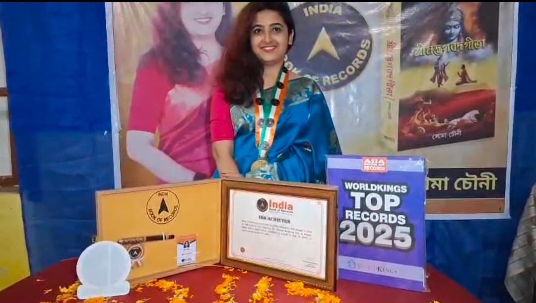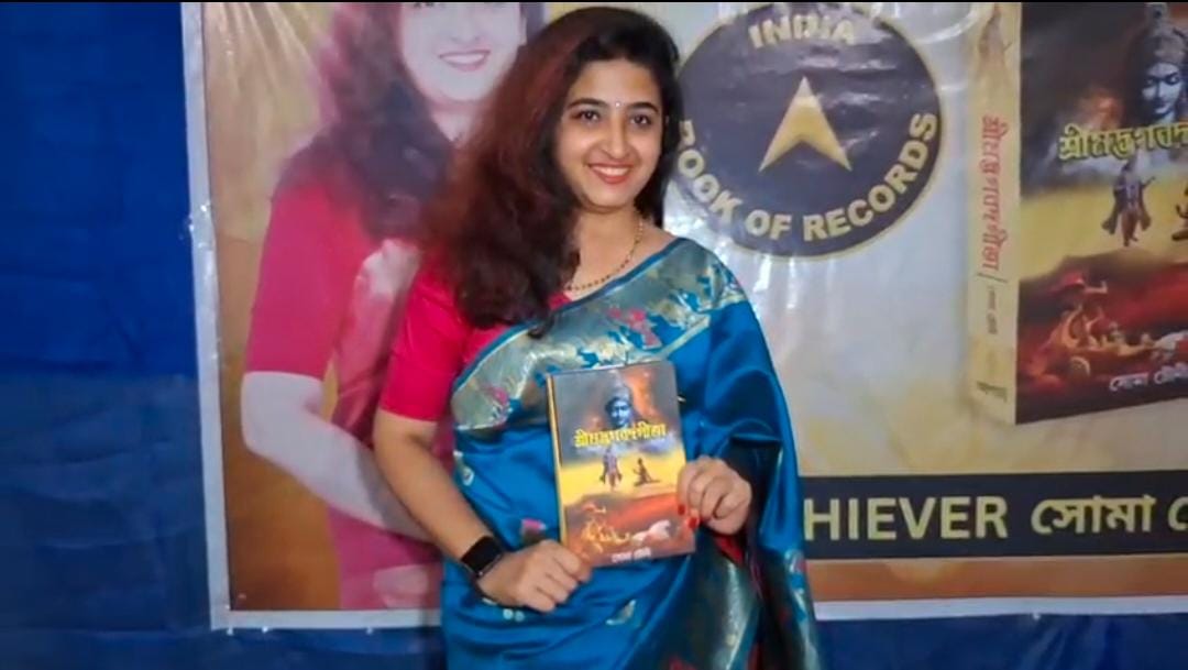 নিজস্ব প্রতিনিধি , বাঁকুড়া - শ্রীমদ্ভগবদগীতা বঙ্গানুবাদ করে নজির গড়লেন বাঁকুড়ার বাসিন্দা সোমা চৌনী। সর্বকনিষ্ঠা বাঙালি মহিলা অনুবাদক হিসেবে ইণ্ডিয়া বুক অব রেকর্ডসে স্থান পেয়েছেন শিক্ষিকা সোমা চৌনী। সম্প্রতি রেকর্ড কর্তৃপক্ষের পক্ষ থেকে শংসাপত্র, মেডেল সহ স্মারক সামগ্রী হাতে এসে পৌঁছেছে।