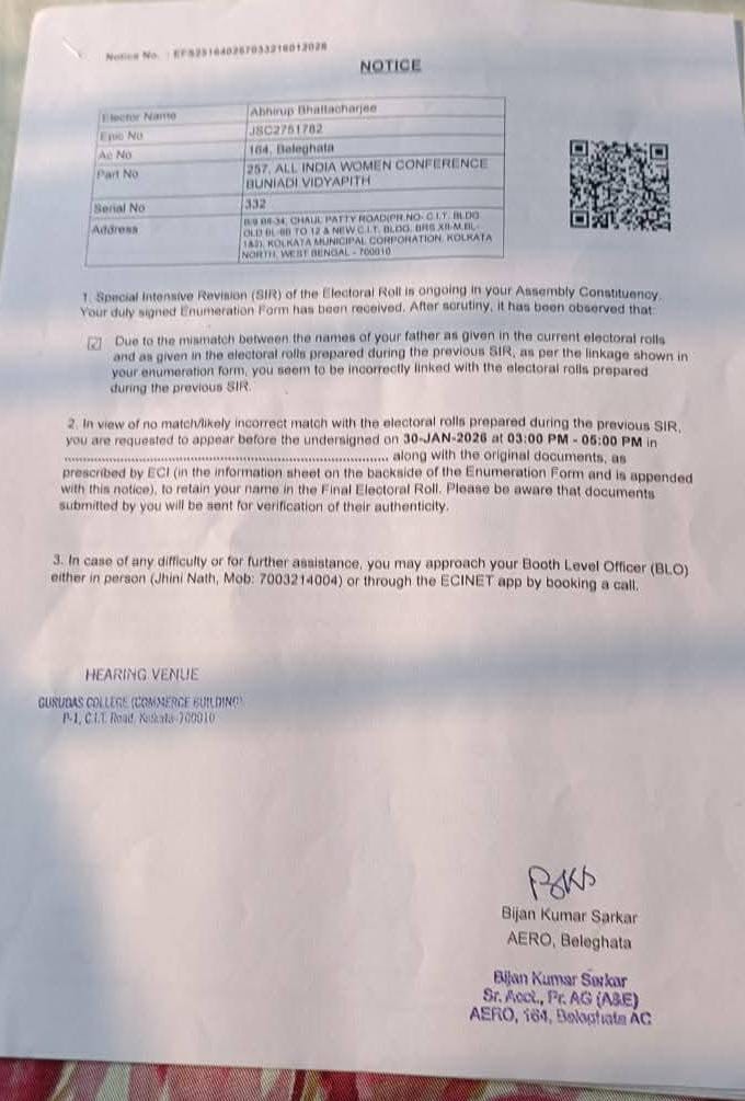 এই প্রসঙ্গে, বিডিও অভিরূপ ভট্টাচার্য জানিয়েছেন, তার বাবা ভারত সরকারের প্রাক্তন পদস্থ আধিকারিক এবং মা বিএসএনএলের অবসরপ্রাপ্ত ইঞ্জিনিয়ার। ২০০২ সাল থেকেই তাদের নাম নিরবচ্ছিন্নভাবে ভোটার তালিকায় রয়েছে। তা সত্ত্বেও নিজের পরিবারের নাম নিয়ে শুনানির নোটিশ পাওয়ায় যথেষ্ট বিস্ময় প্রকাশ করেছেন তিনি। এই বিষয়ে তিনি ঊর্ধ্বতন কর্তৃপক্ষকেও জানিয়েছেন বলে দাবি বিডিওর।